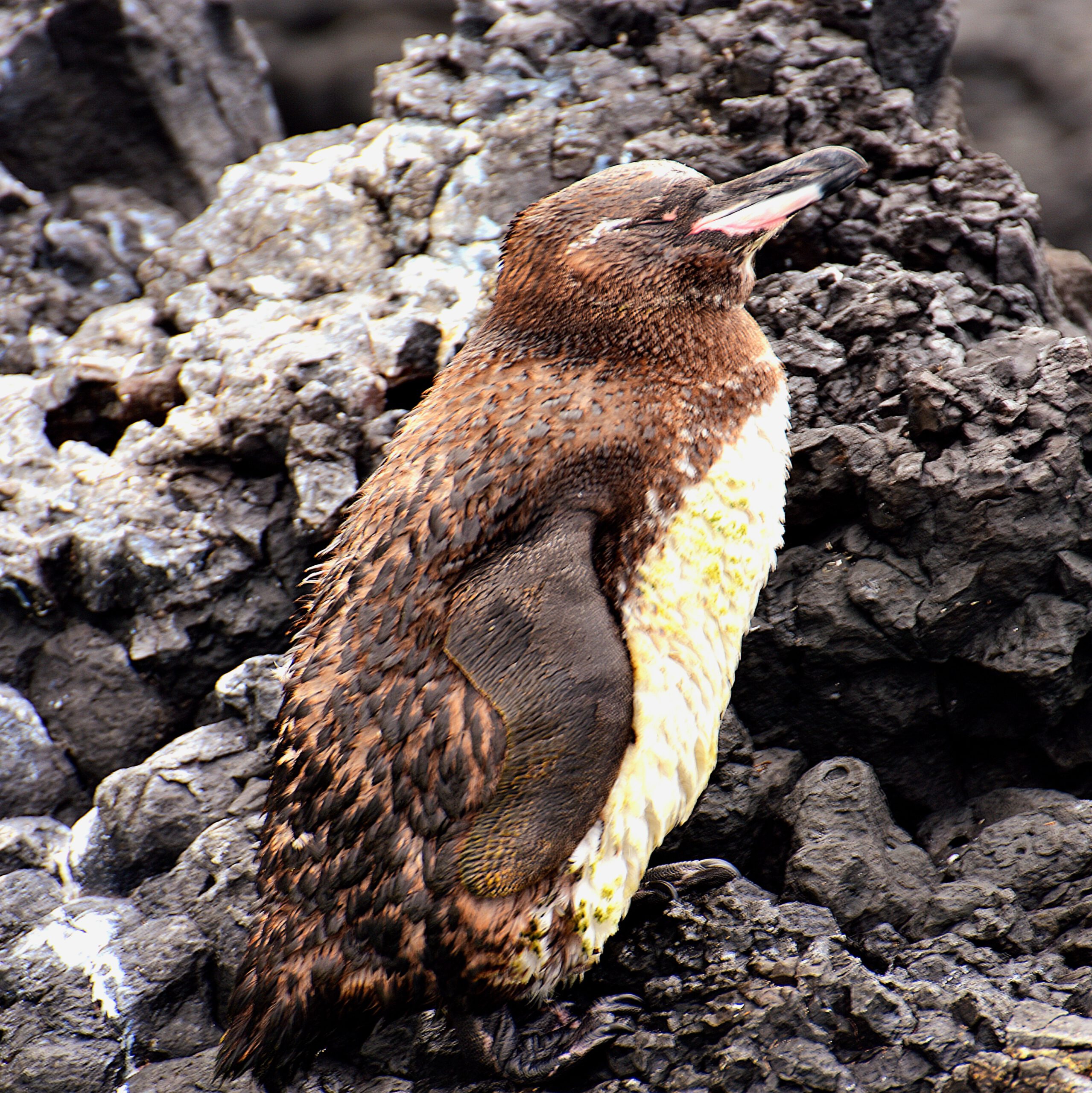 Sonntagsausflug nach Bartolomé. Mit der Yacht Española geht es zum höchsten Vulkankegel der Insel, wo wir auf 115 m den Rundblick genießen. Auf der Hinfahrt werden wir von vielen Delfinen und ein paar Seelöwen begleitet: grandios! Beim Schnorcheln um den Pinakel entdecken wir zwei Pinguine, die sich in 1 m Entfernung putzen, einen Hai und viele Fische, die man aus Riesenaquarien kennt. Die Rückfahrt gestaltet sich aufgrund des hohen Wellenganges schwierig.